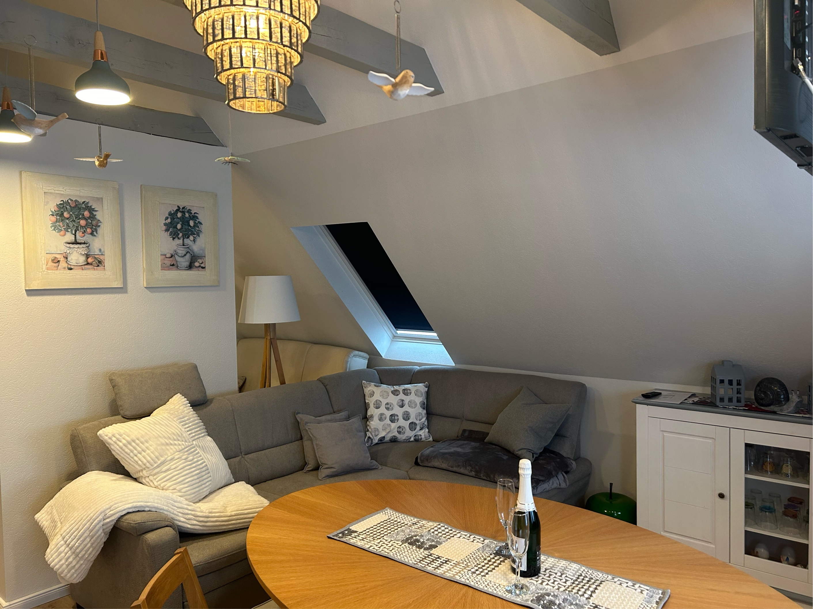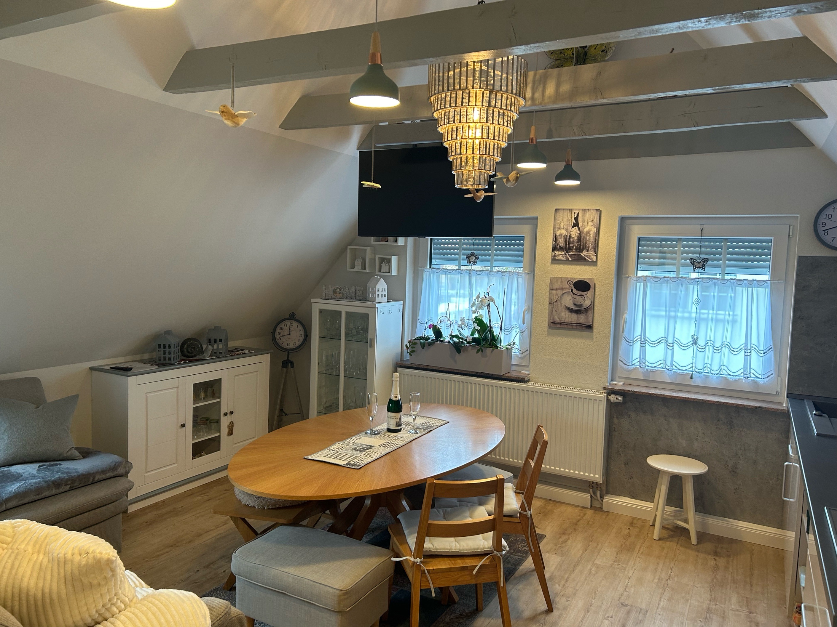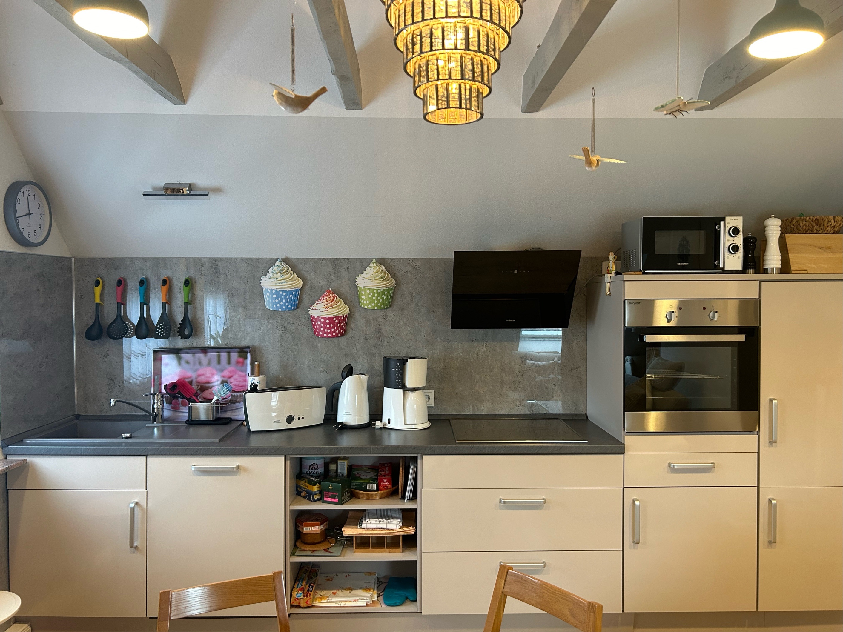 Die Ferienwohnung in der 1.Etage hat eine Fläche von ca. 50 m² und bietet reichlich Platz für eine Familie mit drei Personen. In einer komplett ausgestatteten Wohnküche mit Geschirrspüler, Induktions-Kochfeld, Backofen, Kühl-Gefrierkombination, Kaffeemaschine, Toaster, Wasserkocher sowie Handspüle stehen Ihnen alle Haushaltshilfen zur Verfügung. Ein großer Esstisch, ein Sofa und ein SAT-TV laden zum gemütlichen Essen, Lesen oder Fernsehen ein. Das Badezimmer mit Fenster, Dusche und Fön ist großzügig ausgestattet. Im Schlafzimmer befinden sich ein großes Doppel- und ein Einzelbett, sowie ein geräumiger Kleiderschrank.